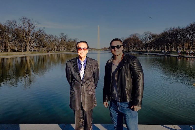 international-day-impunity-journalists_103124_07 Qurban Mamut, left, stands with his son, Radio Free Asia journalist Bahram Sintash, in front of the Washington Monument in Washington D.C., 2017. (Courtesy of Bahram Sintash)