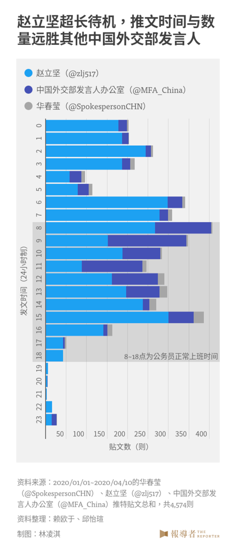 在本篇报导搜集的资料中,同样能明显发现赵立坚发文量远大于另外两个外交部发言人账号,上班时间以外也很常发文。