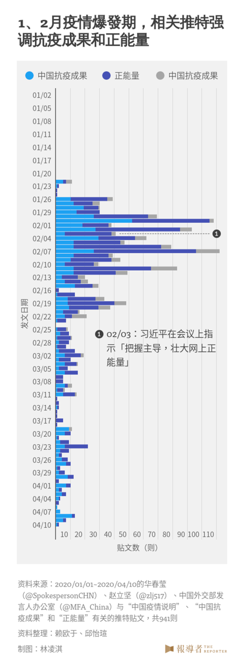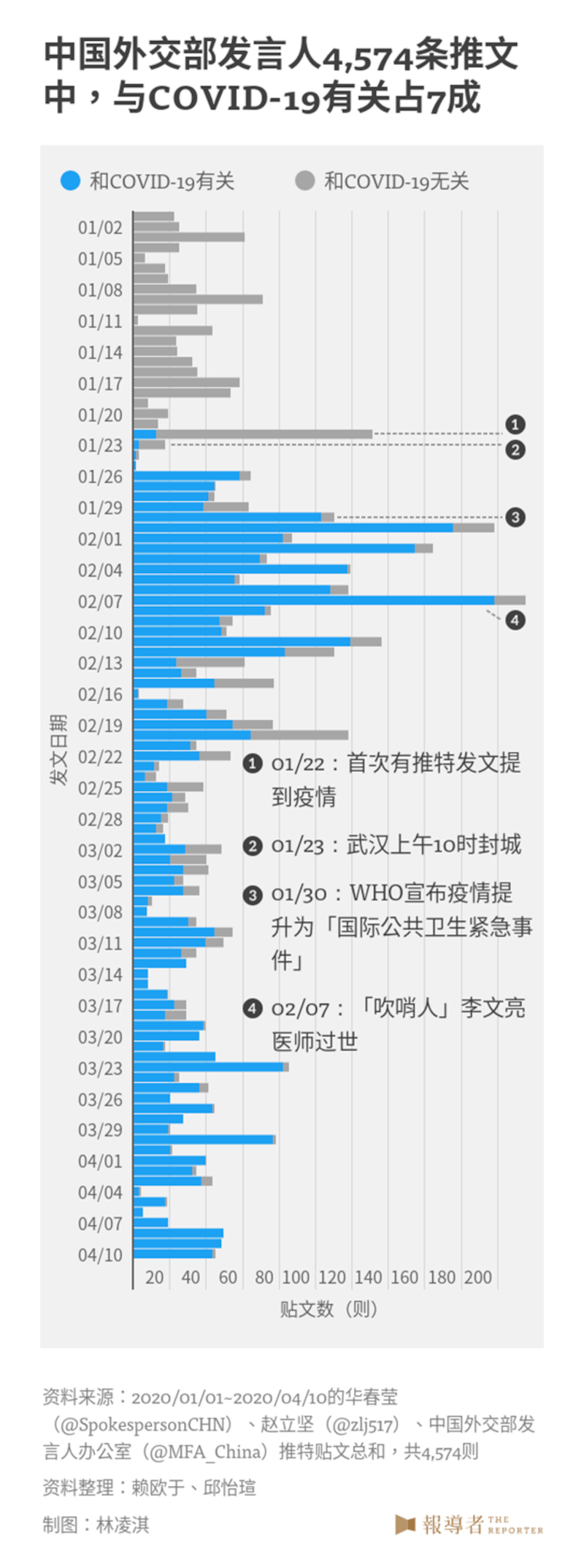 乔治.奥韦尔(George Orwell)在小说《1984》中提到,“谁控制了过去就控制了未来。谁控制了现在就控制了过去。”操控历史一直是不少政权的运作方式,对不少强权来说,如今是谁掌控了社群媒体的话语权,就能够模糊焦点,并重塑历史。中国大外宣近来因COVID-19(又称武汉肺炎、新冠肺炎)疫情格外被重视,如今,推特也成为撰写历史的新战场。《报导者》搜集过去100天中国外交部的推特(Twitter)讯息,来探索这场外交推特上的大外宣是怎么布局,那些透露的讯息和未明说的企图又是什么?