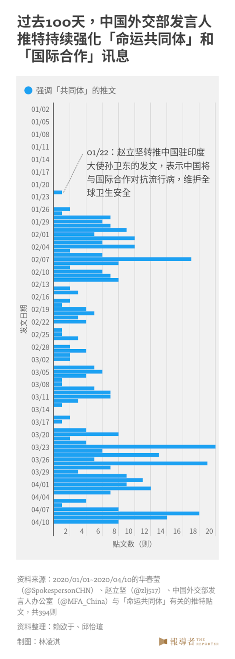 在这场关于疫情的论战中,中国外交部发言人的推文遵循着中共的核心思想,从最初的消声,到强调正能量与政府的抗疫成果;在“战狼式”发言的同时,也呼吁国际合作与“人类命运共同体”;摆脱“疫情重灾区”的被动处境后,中国正努力建构着一个向世界输出物资与经验的“伸援大国”。